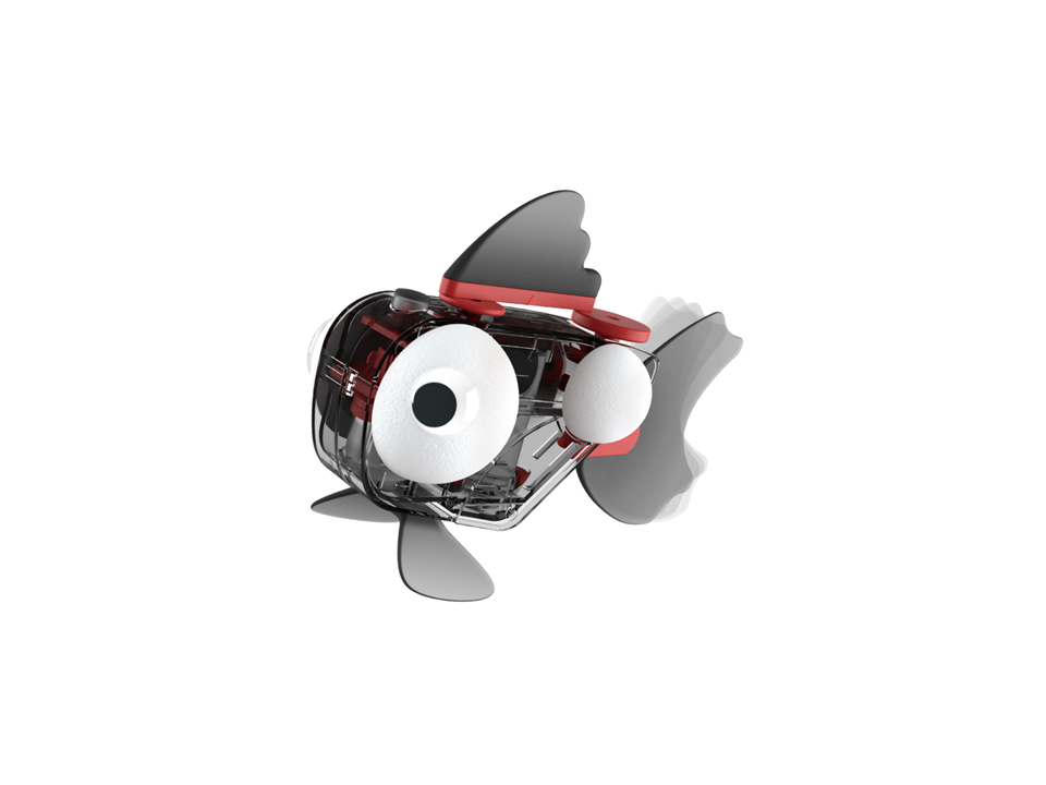 ロボスイミーは、やわらかな素材でできたひれと、発泡スチロール製の大きな目が特徴の金魚形ロボットです。水に入れると浮かびモーターの力でひれを動かしてプカプカゆらゆら泳ぐ様子はとてもかわいらしいです。