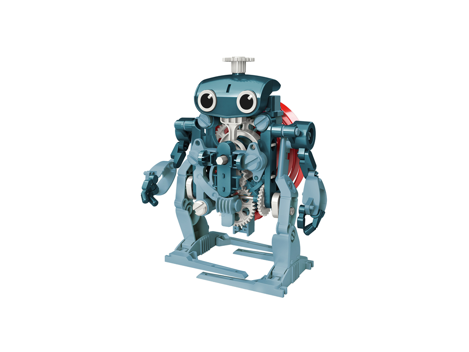 ロボタイミーは、プラスチック製のゼンマイをグルグル巻いてパワーを生み出すロボットです。メカはゼンマイで動くので、乾電池もモーターも使用しません。