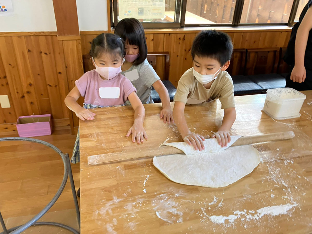 うどん作りでは、足で踏みながら生地をこねるなど、本格的な体験が出来ます。