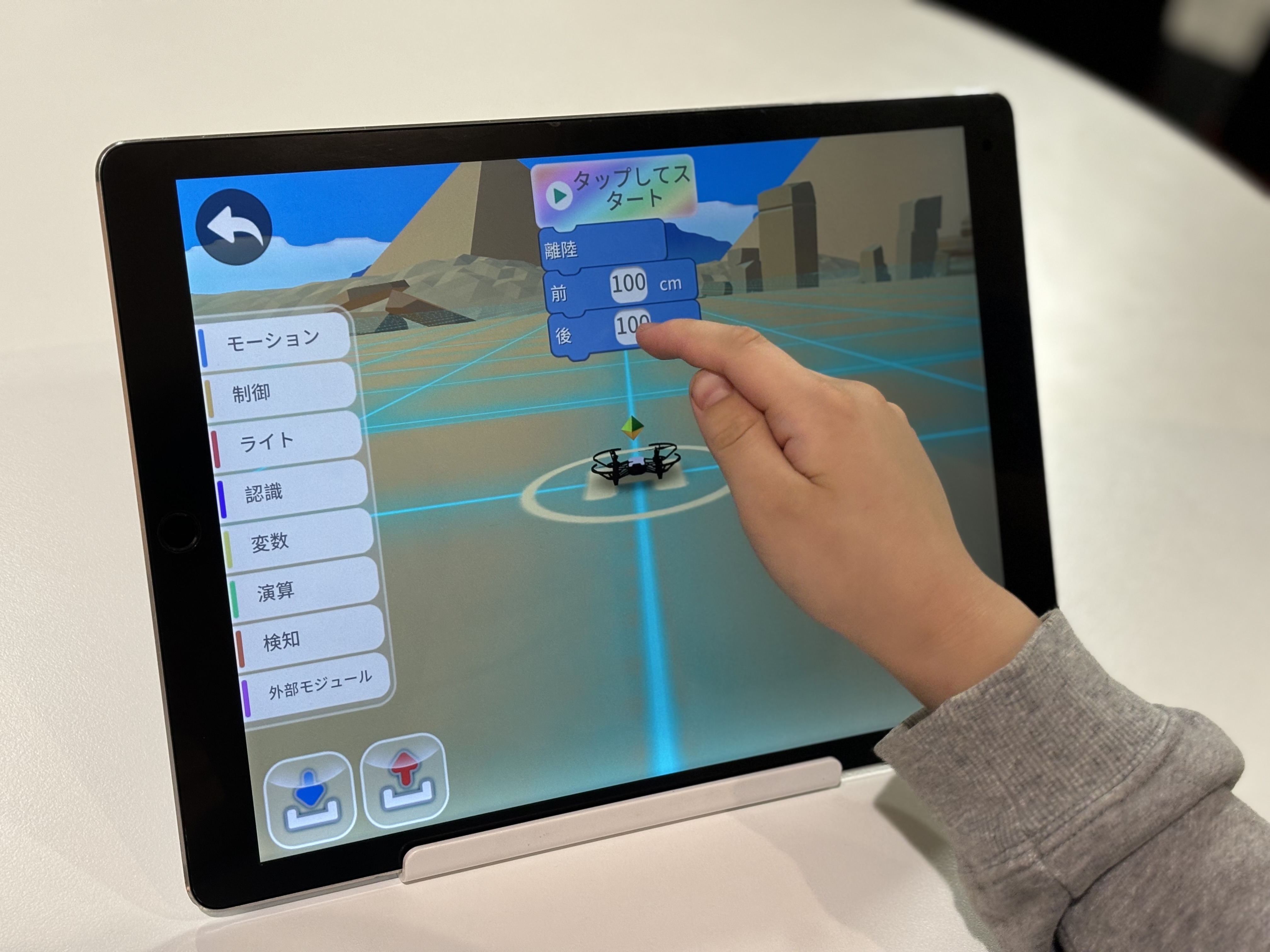 ドローンに動きをプログラミングし、操縦体験を行います。