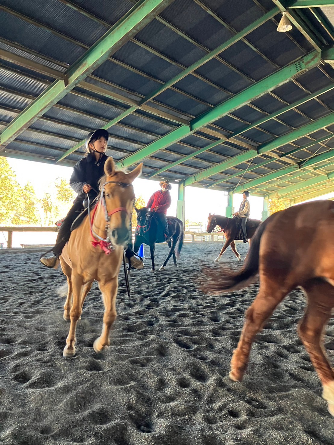 馬と心を通わせて心身ともに成長できます。騎乗レッスン以外に、手入れや馬房(馬のお部屋)掃除、馬学(馬に関する勉強)、お楽しみイベントも行います。