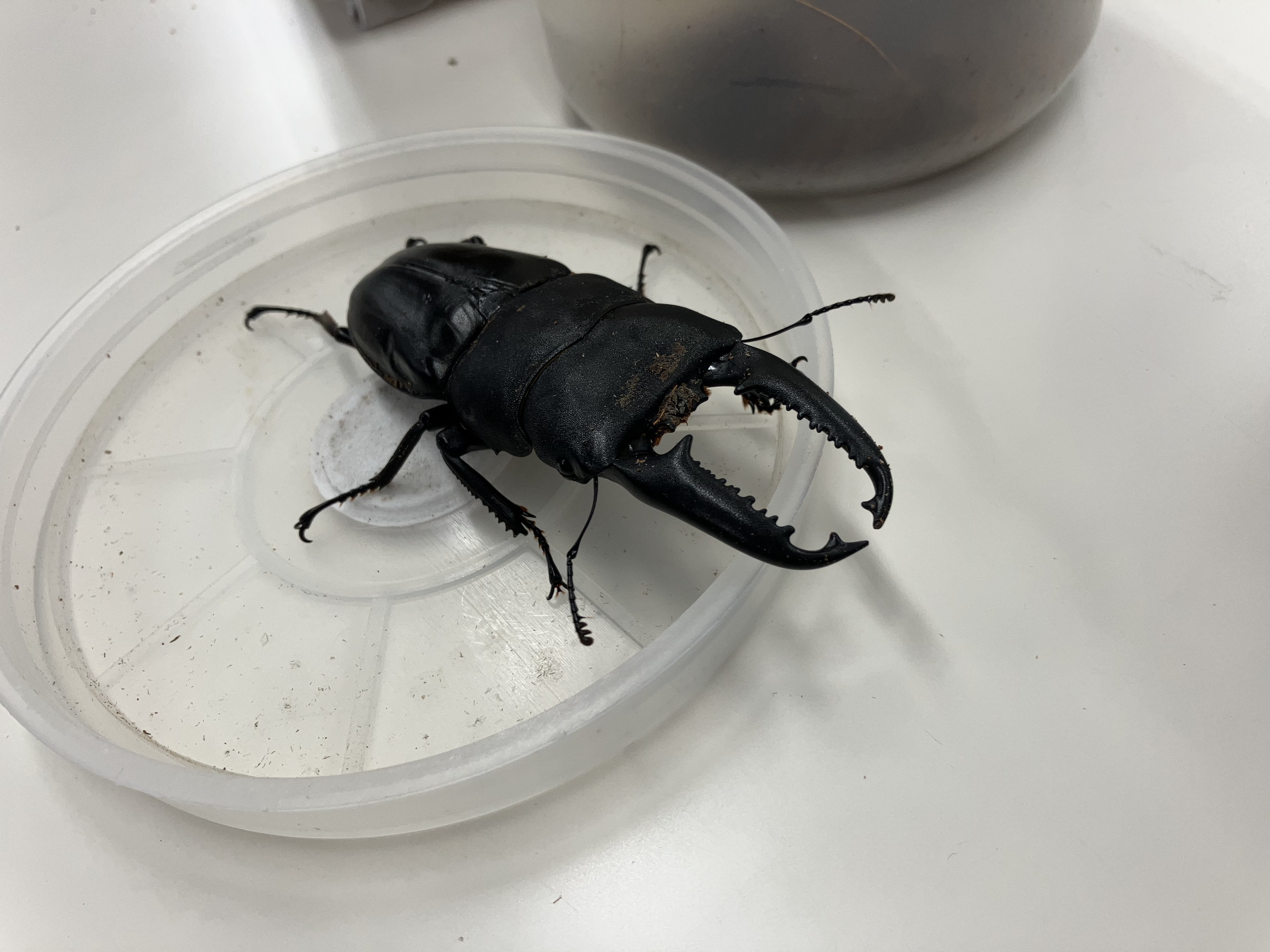 海外からとりよせたパラワンオオヒラタクワガタを飼育セットとともにお渡しいたします。