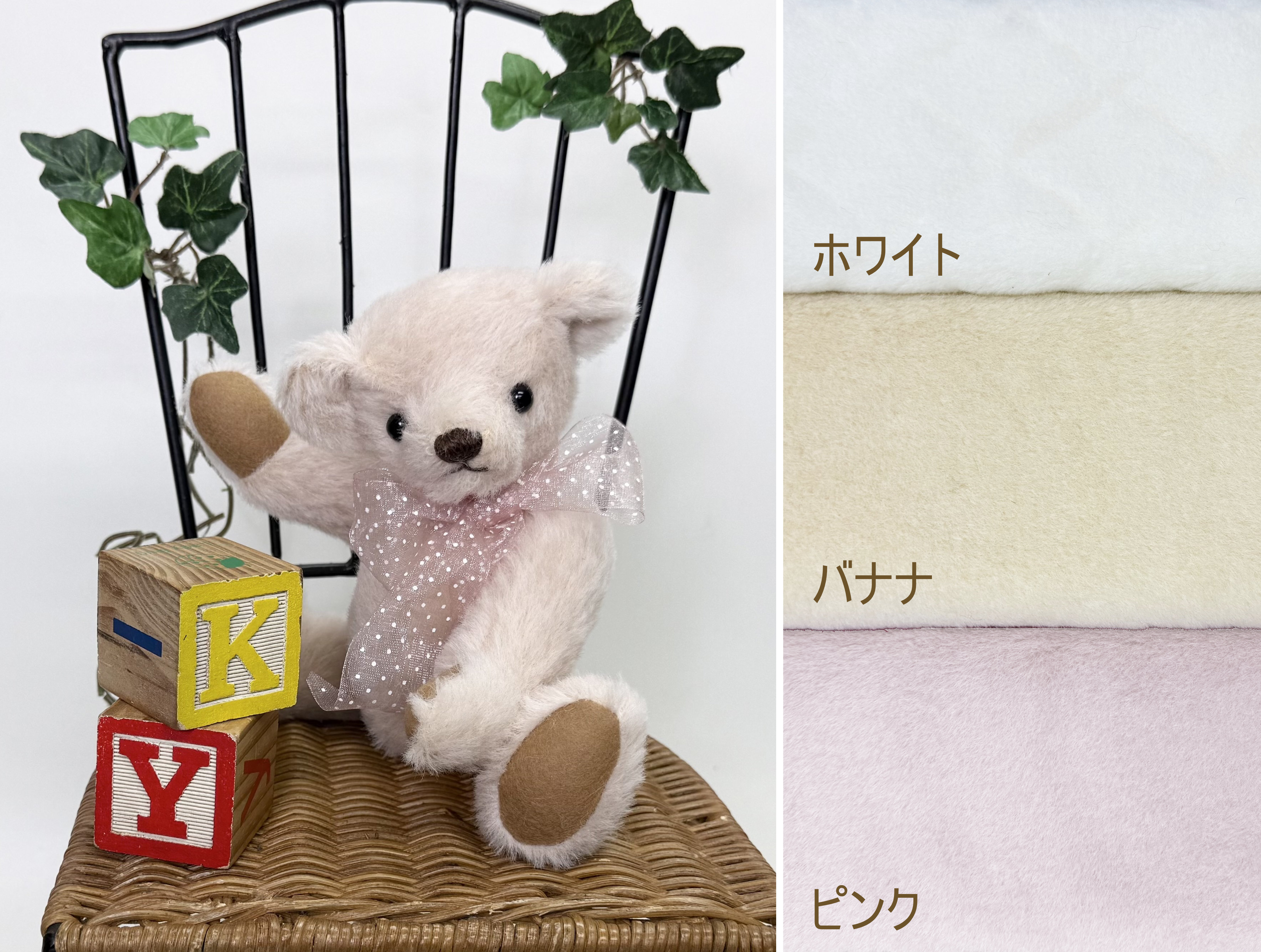 今回は3色のアルパカ生地のなかからひとつを選んで作成します。(ベアのサイズは縦約22cm)