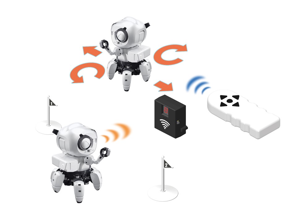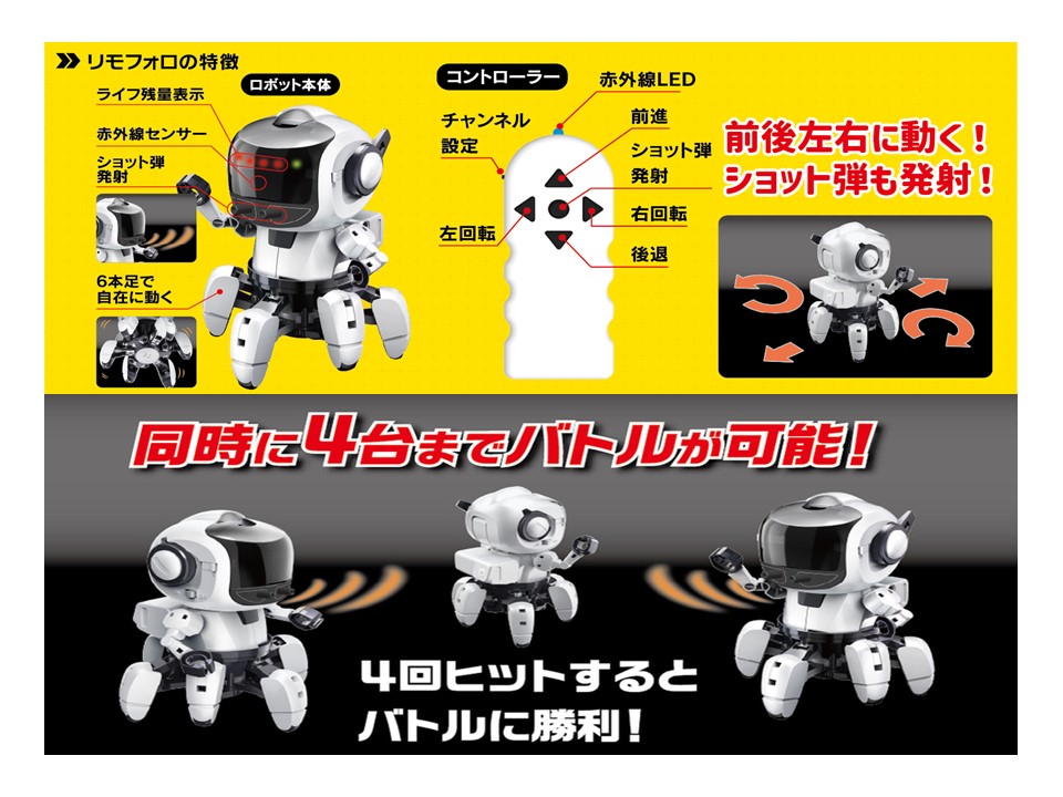 リモフォロは赤外線で操作する6足歩行ロボットになります。コントローラーから出る赤外線の信号で6本足のロボット本体を前後左右、思いのままに動かすことができます。