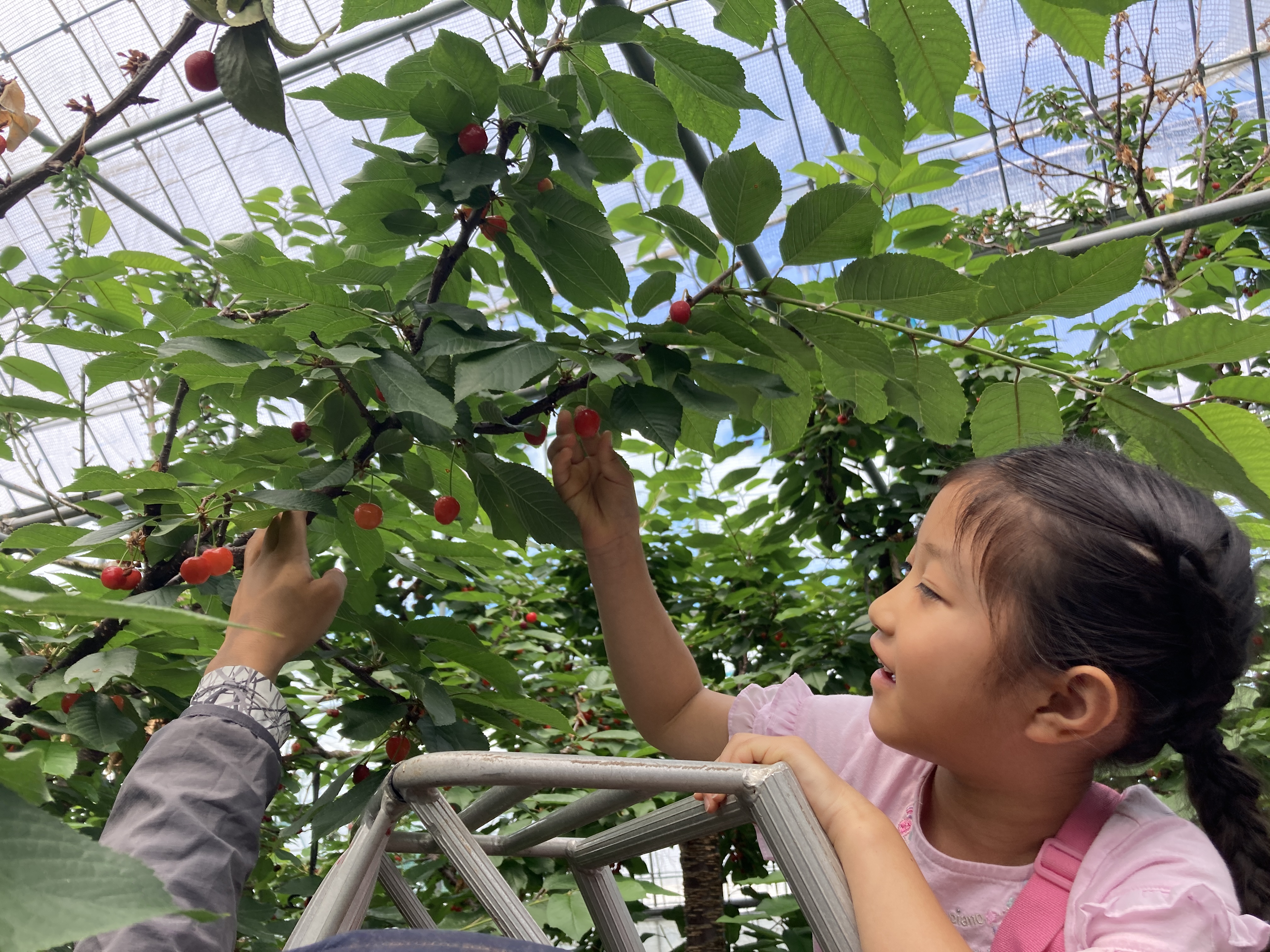 お子さまの手の届かないところにあるさくらんぼの収穫は弊社スタッフがお手伝いいたします。