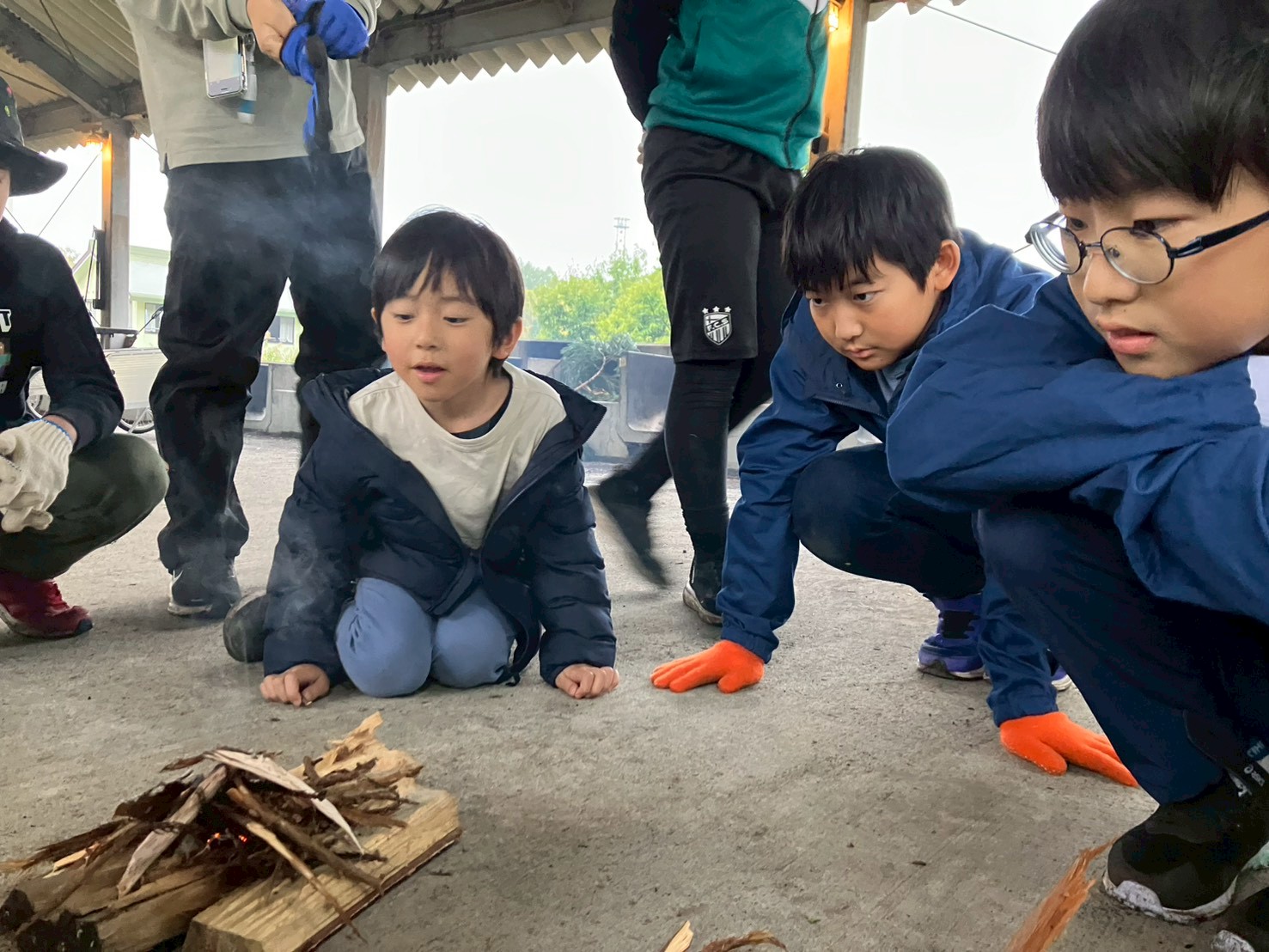 作ったファイヤースターターで火起こし体験もします。ファイヤースターターの安全な使い方も学び「便利な道具を正しく使う」ことの大切さを学ぶ機会にもなります。
