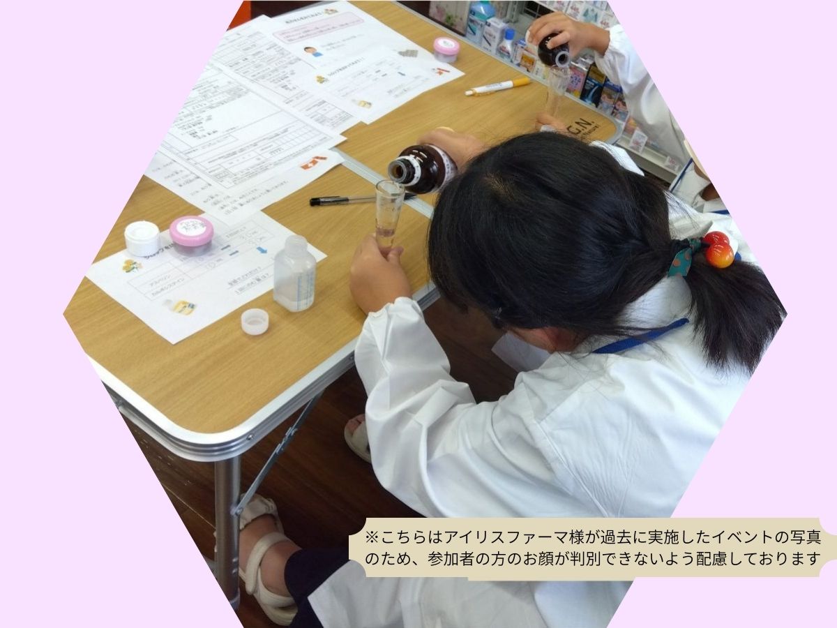薬局を貸切り、本物の医療器具を使用した“本格的な体験”をご用意しております。楽しみながら実際の業務さながらの体験をすることで、薬剤師という仕事を知るきっかけになります。また、お子様に白衣をご用意しておりますので、気分はまるで本物の薬剤師さんです!