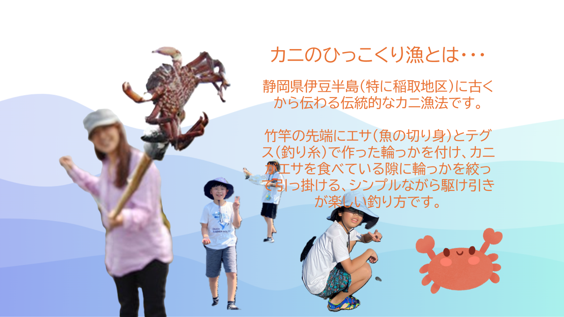 静岡・伊豆の伝統漁法「ひっこくり漁」にチャレンジします!長い棒を使って捕まえるので、少し生き物が苦手なお子様でもチャレンジしやすいです。お子様達が好きな「さがす」「あつめる」「観察する」の要素が入っており、伝統を学びながら楽しめる体験です!