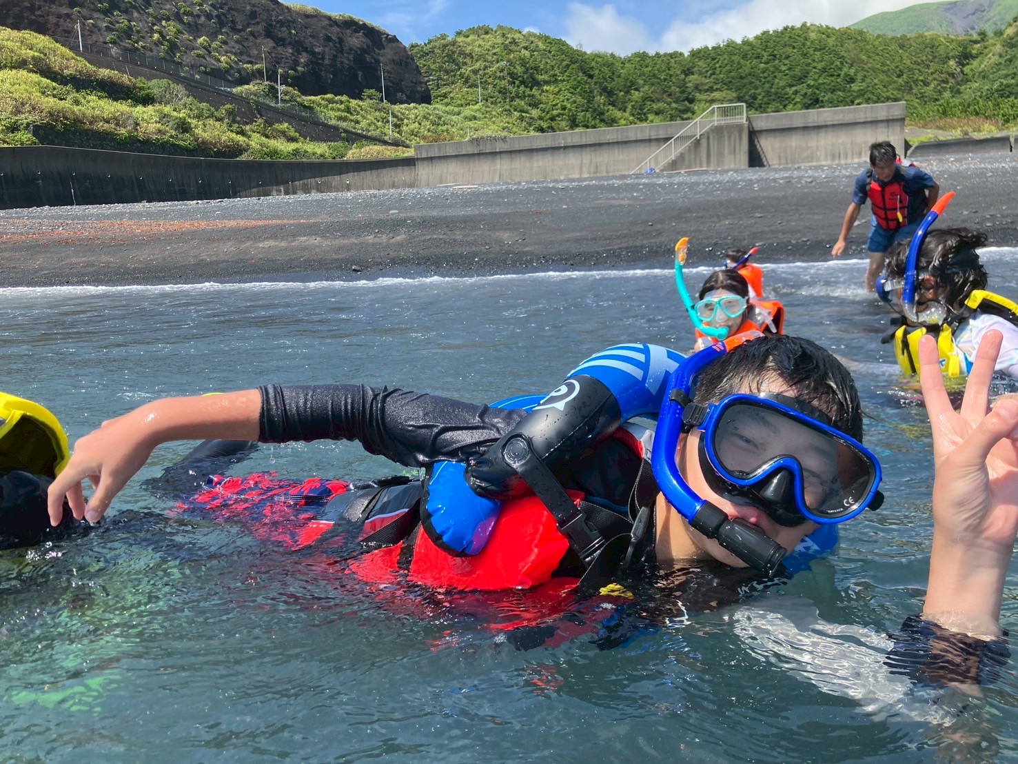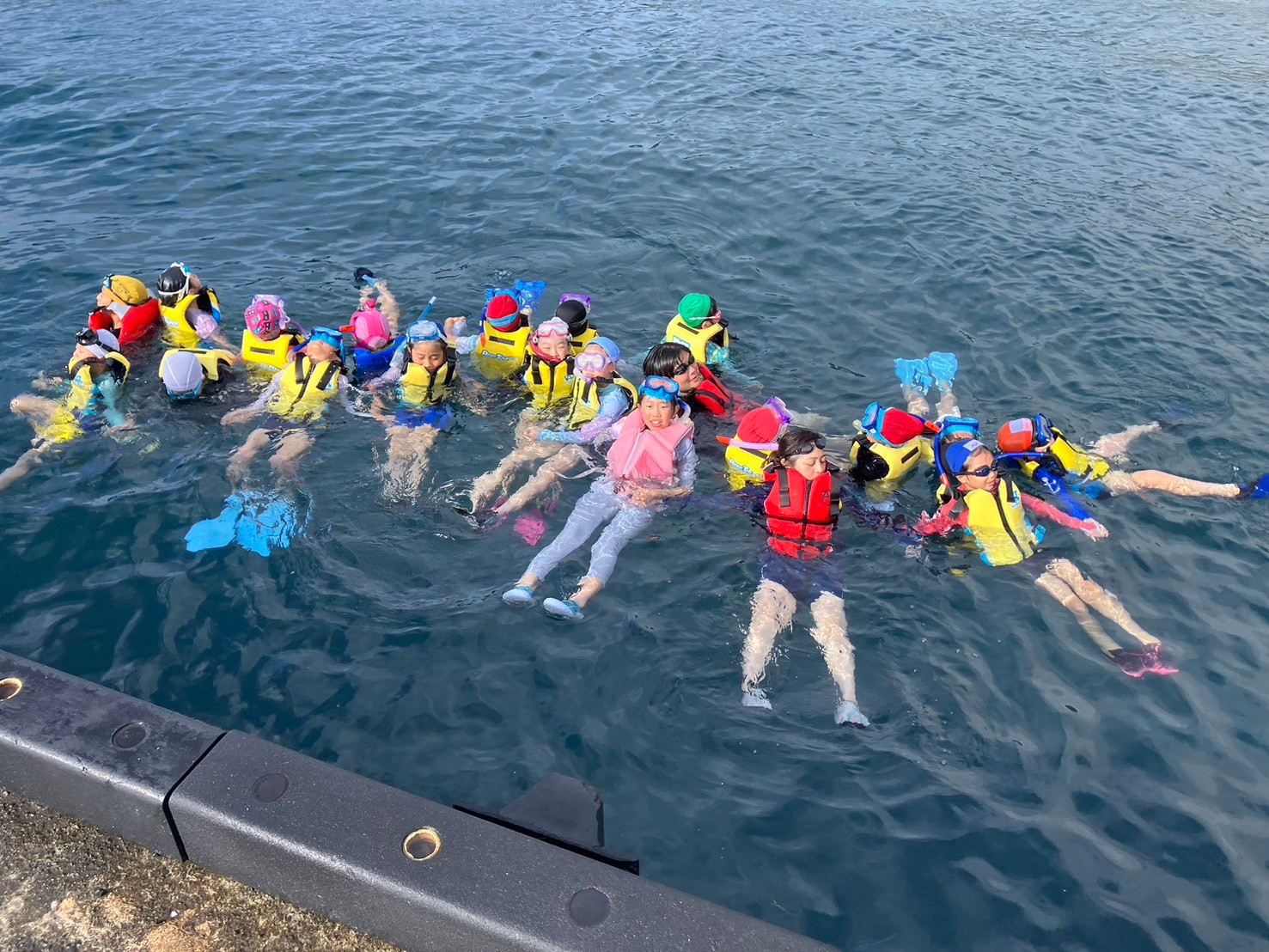 海のプールではシュノーケリングも楽しみます。岩に囲まれている環境により、波の影響がかなり少ない為、低学年のお子様も安心してシュノーケリングで生き物観察ができます。まさにお子様たちのためのシュノーケリングスポットです!
